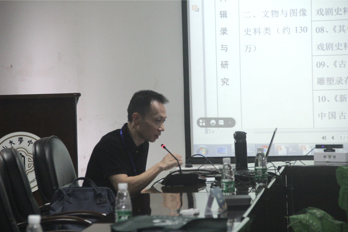 课题首席专家黎国韬就项目的学术依据、设计创新、总体框架、基本研究思路等方面作了全面而详细的汇报。该课题旨在对传世文献、出土文献、海外汉籍、考古文物与图像、传世文物与图像等进行仔细考察,从中搜集、辑录出较为完备的“中国早期戏剧史料”,并对史料进行分类、编排、选择、校勘、标点、考辨、编年、注释等工作;在此基础上,利用多重证据法,对这批史料作出专业、精深、细致、有特色的学术研究,力图重新认识中国早期戏剧的特色和特质,从而在“戏剧起源、戏剧形成、戏剧成熟、戏曲渊源、戏曲生成、表演制度、演剧场所、宗教与戏剧关系、入华胡戏、戏剧东传”等多个重要问题上推动中国古代戏剧史研究的发展,并丰富相关研究领域的学术思想和治学方法。
